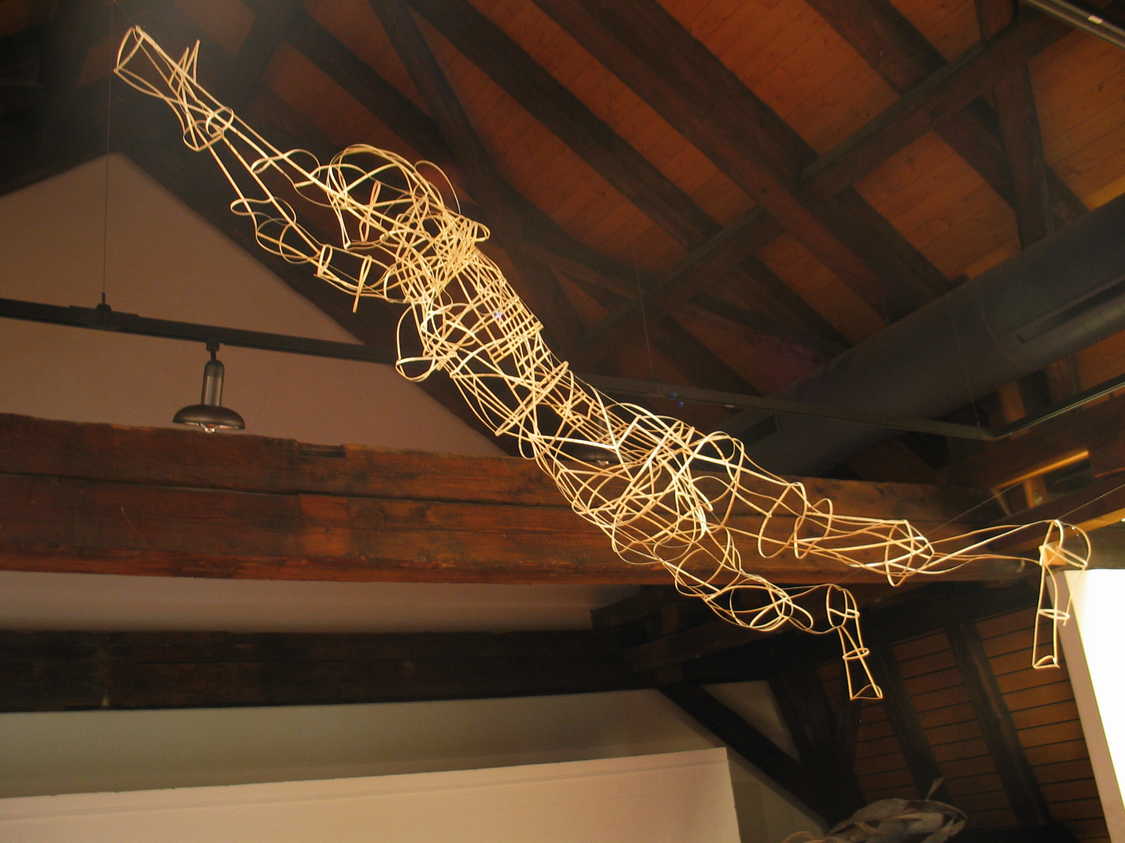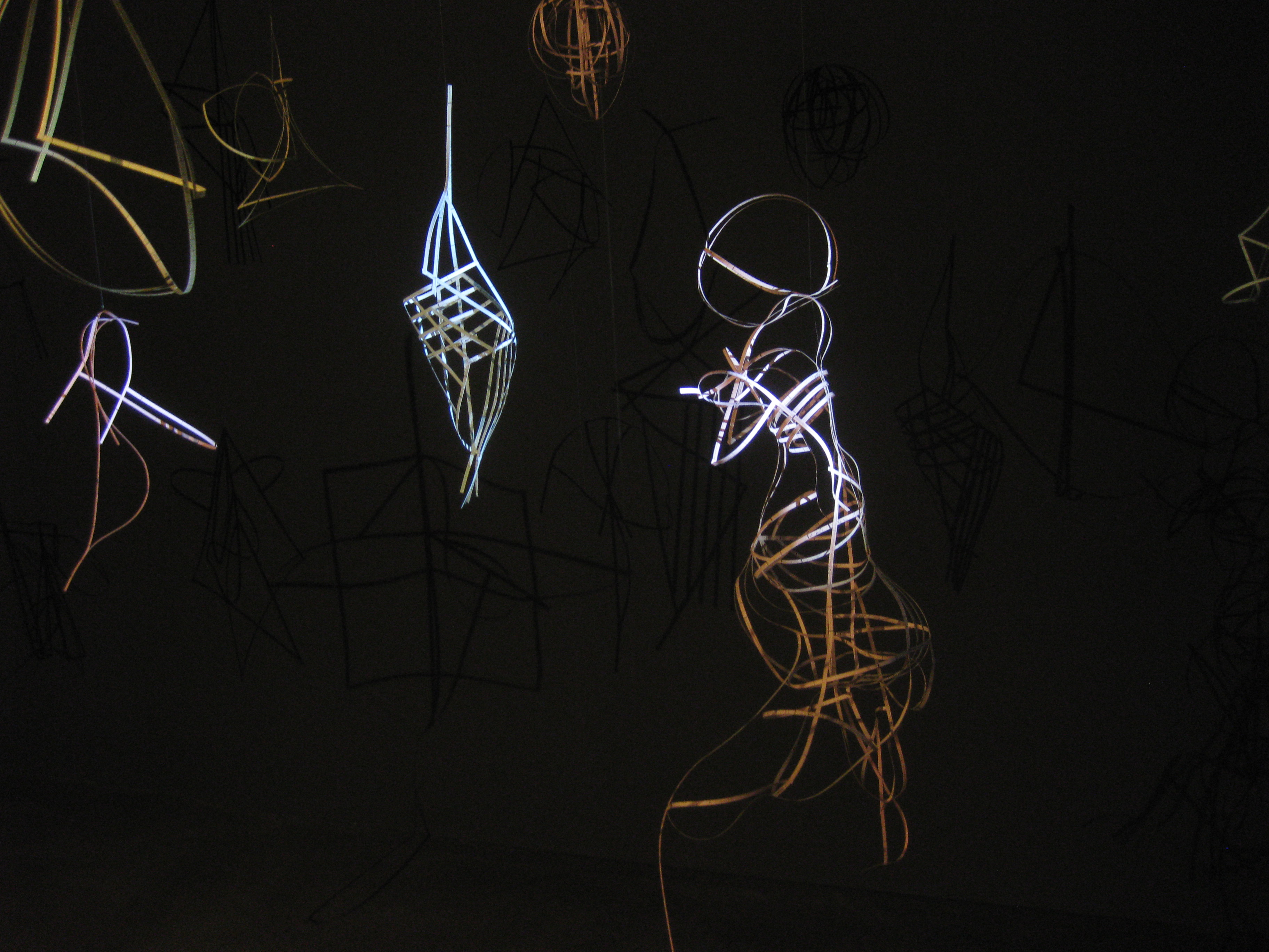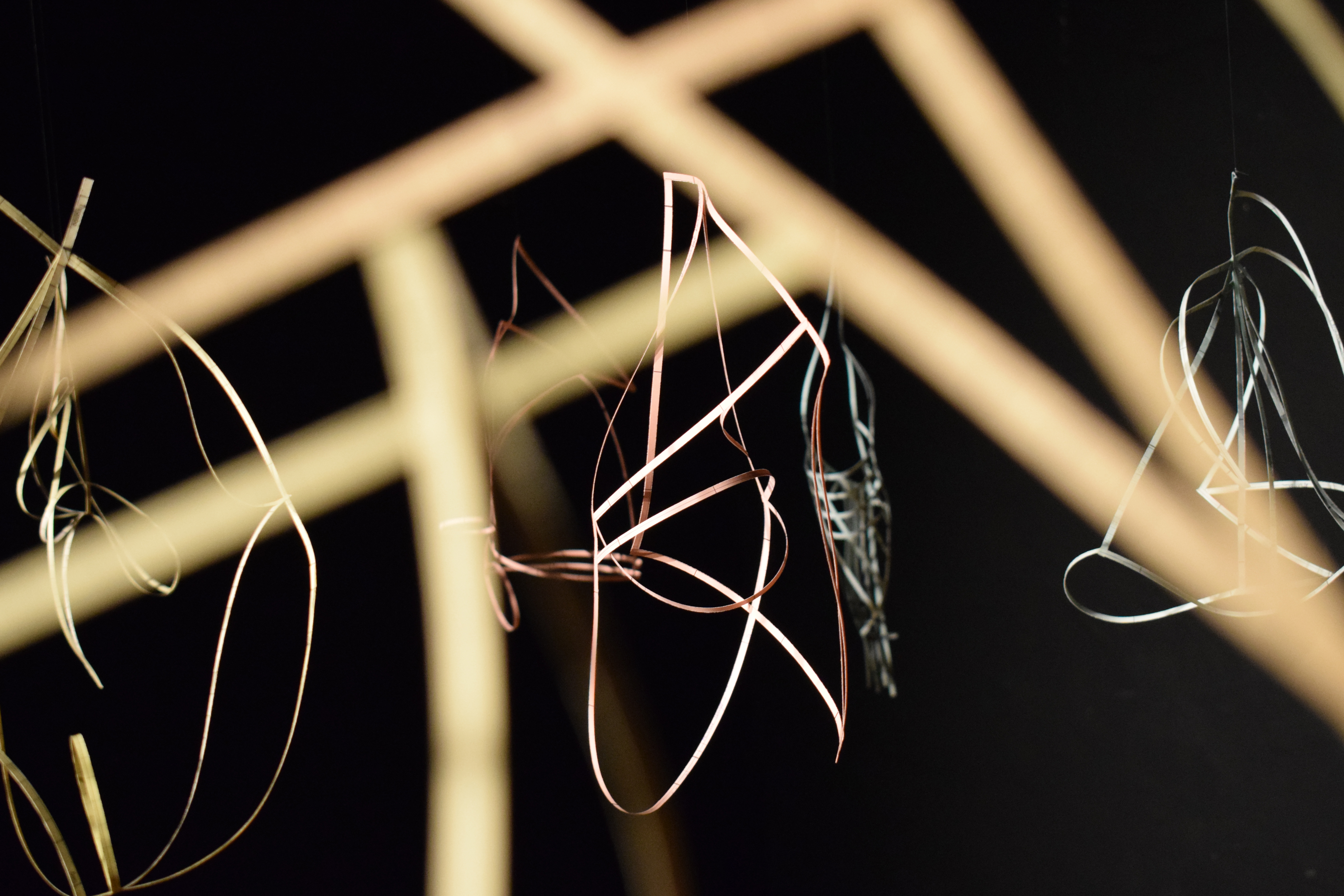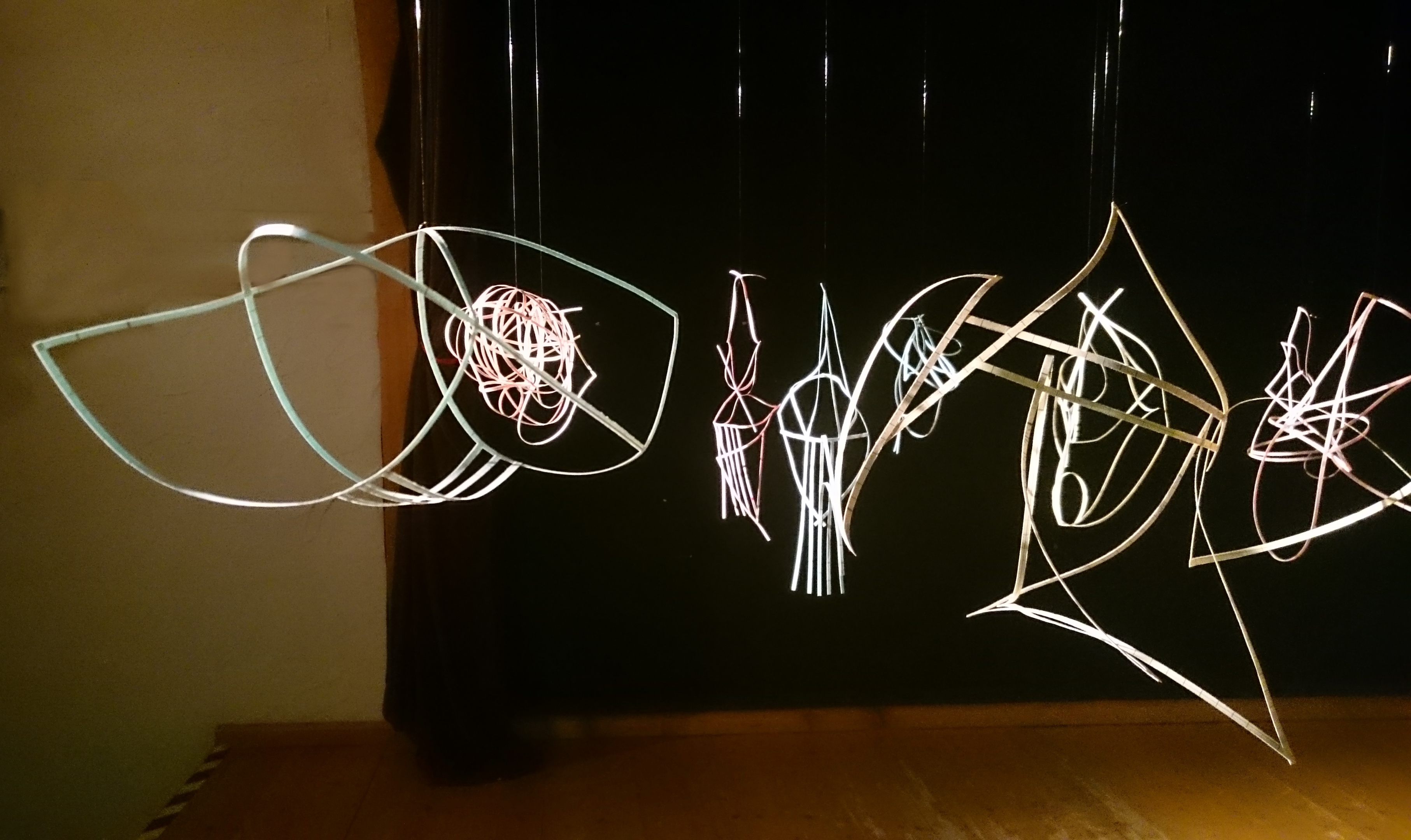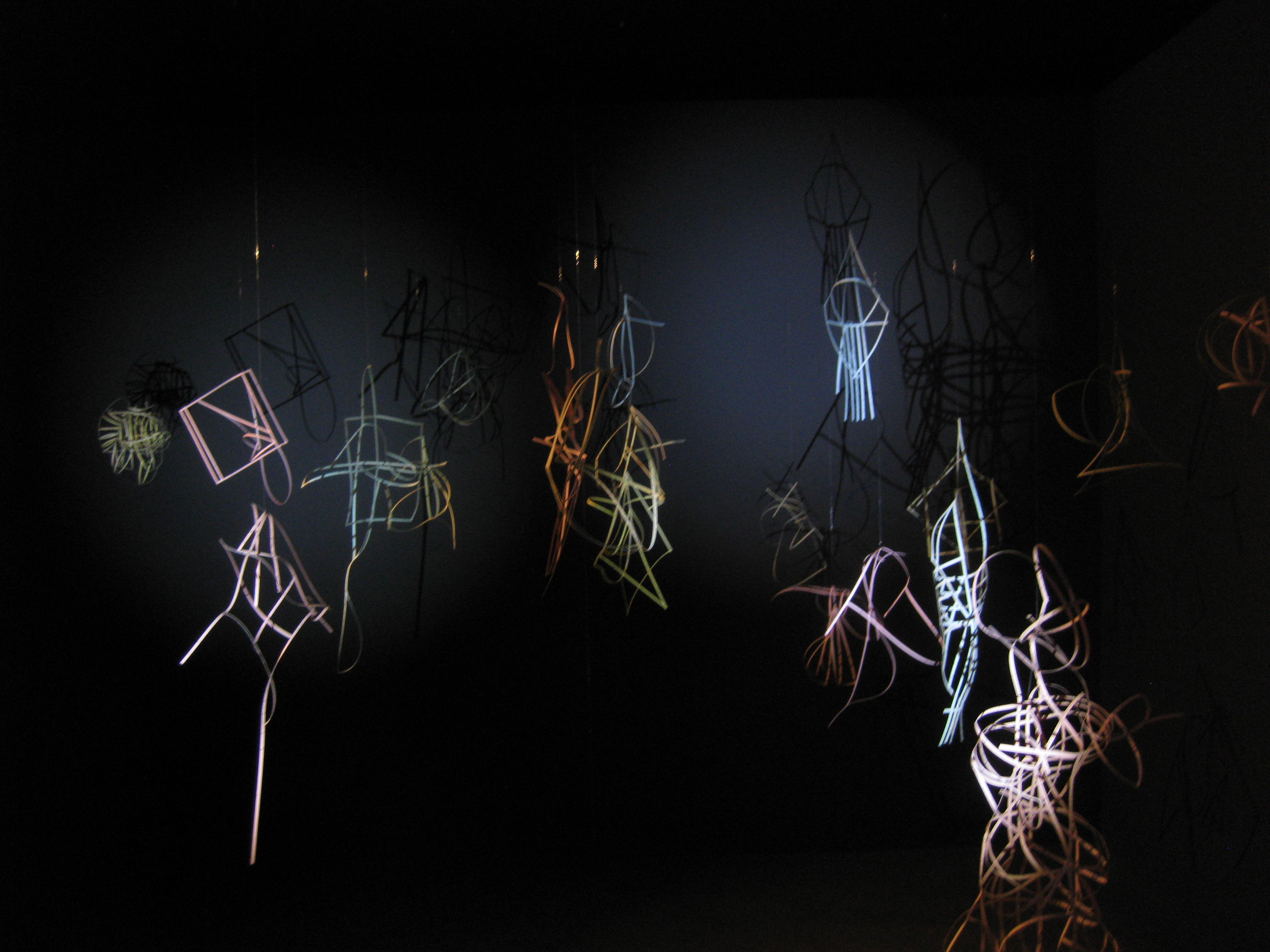 Die Objekte wiegen nur wenige Gramm und sind nur an einem Nylonfaden aufgehängt. Sie erscheinen als dreidimensionale Zeichnungen im Raum, die sich in der Luftströmung bewegen oder sehr langsam in Bewegung gesetzt werden.