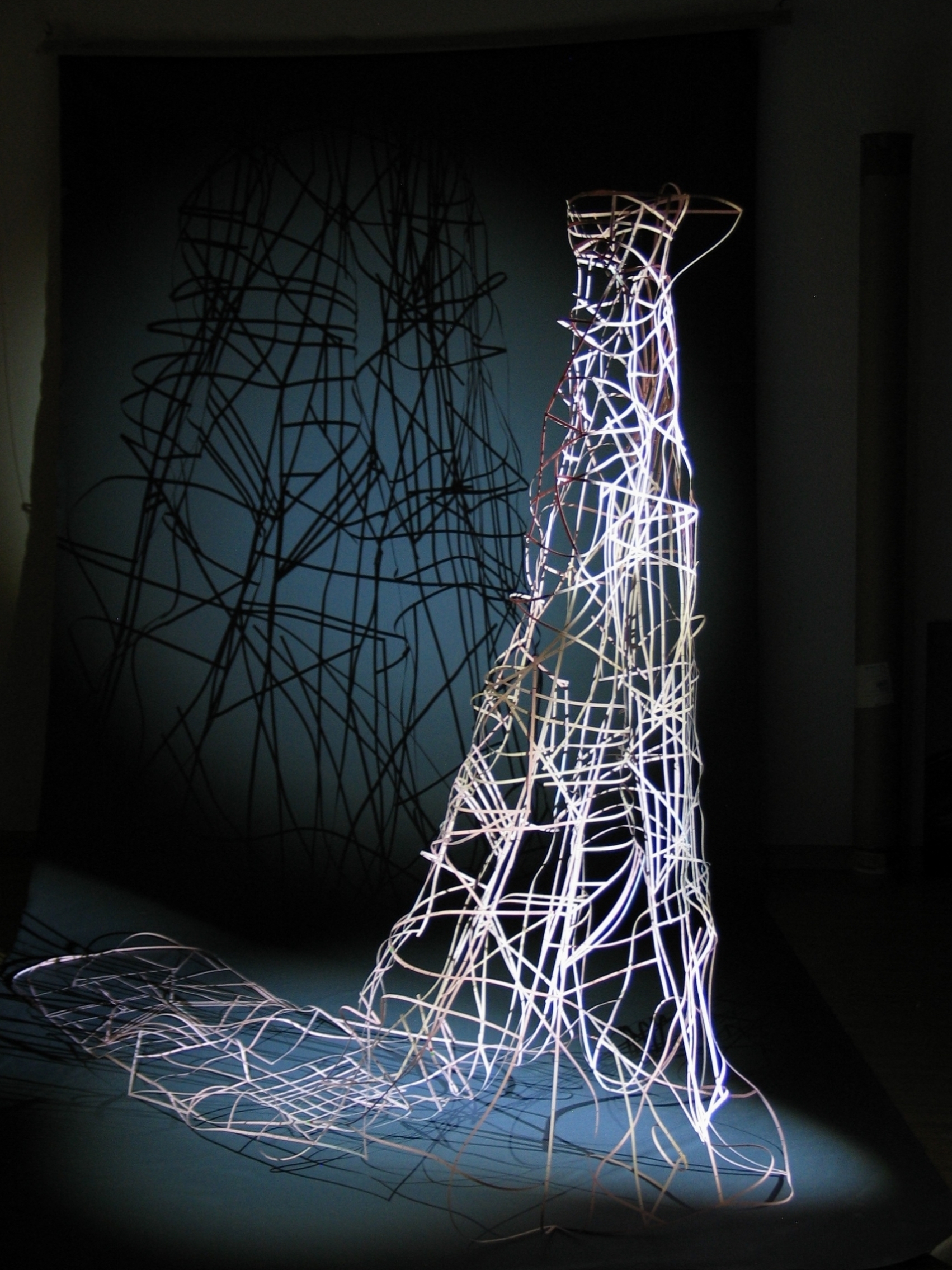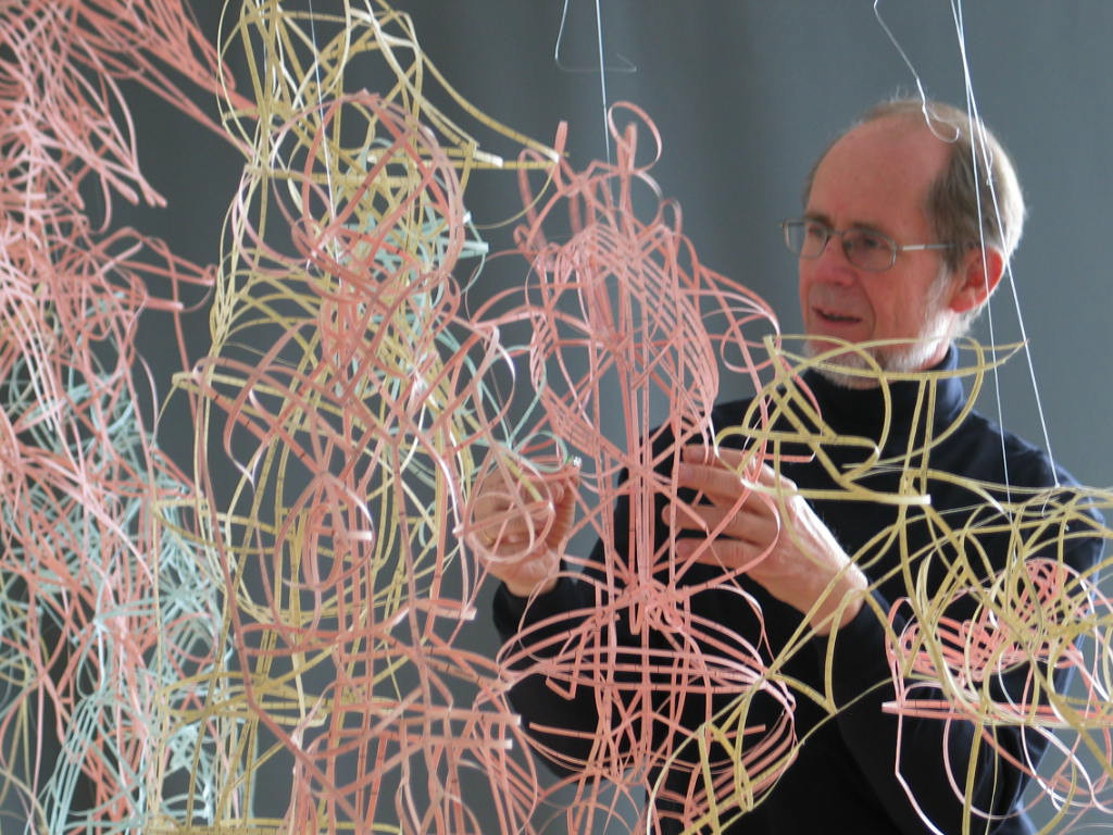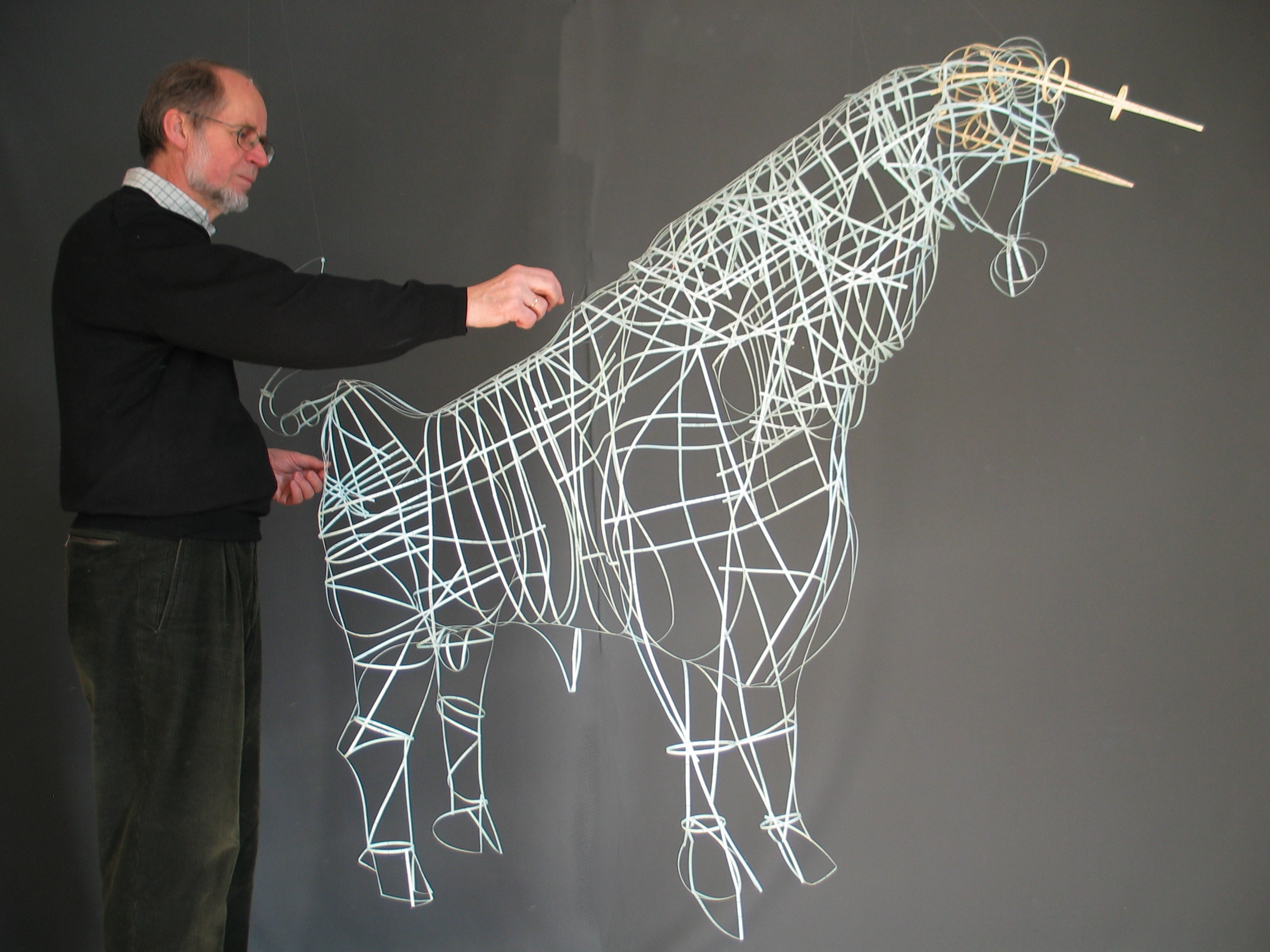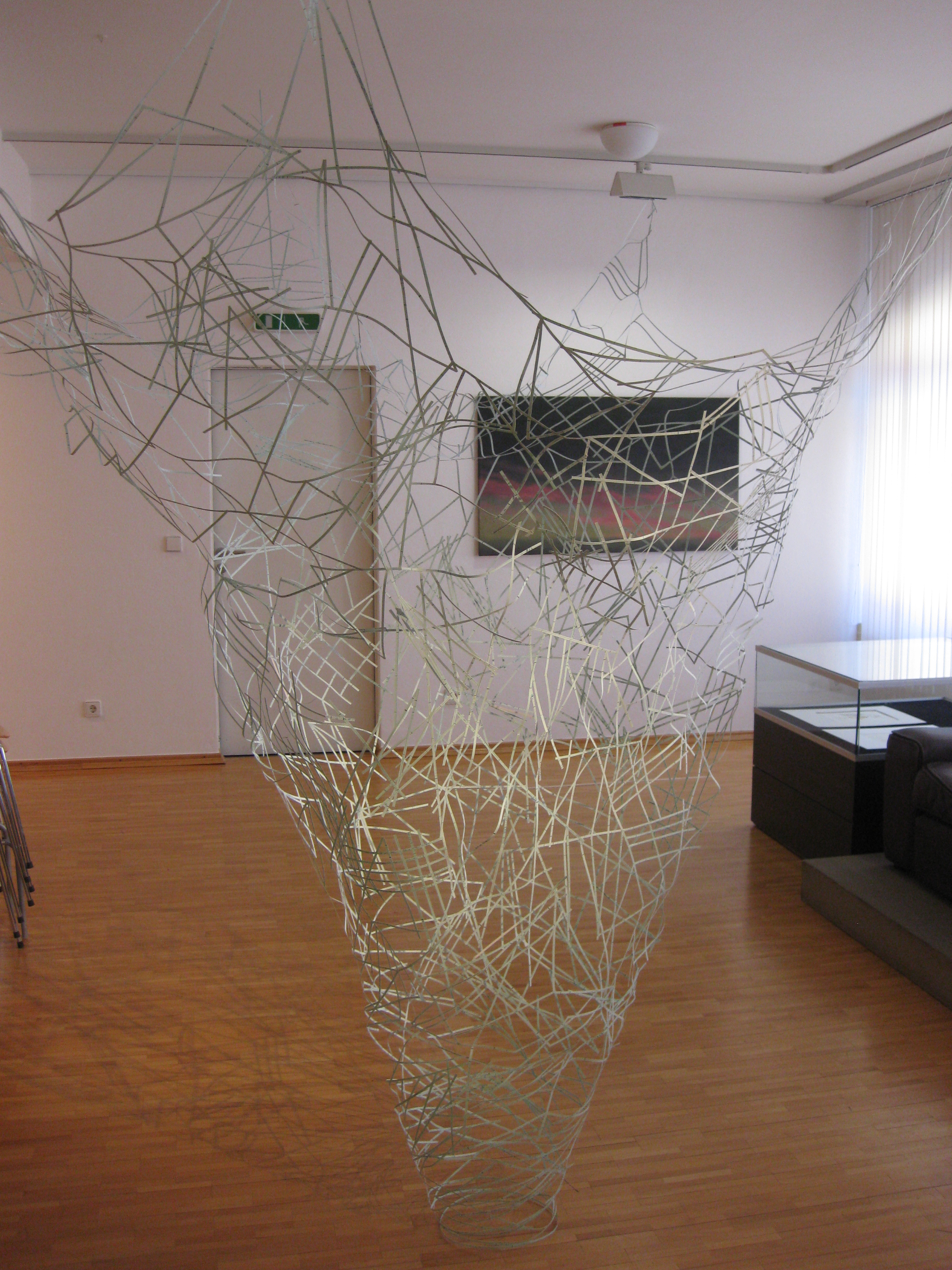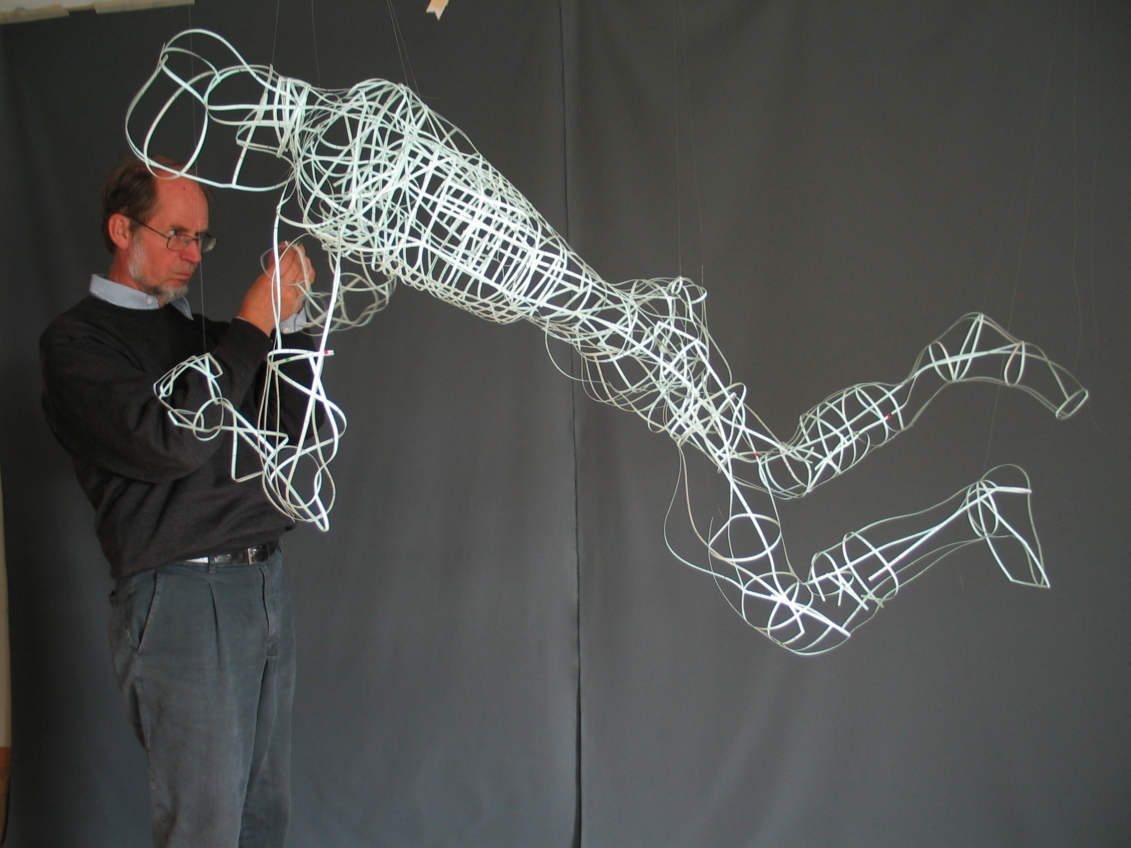 Die Objekte wiegen nur wenige Gramm und sind nur an einem Nylonfaden aufgehängt. Sie erscheinen als dreidimensionale Zeichnungen im Raum, die sich in der Luftströmung bewegen oder sehr langsam in Bewegung gesetzt werden.