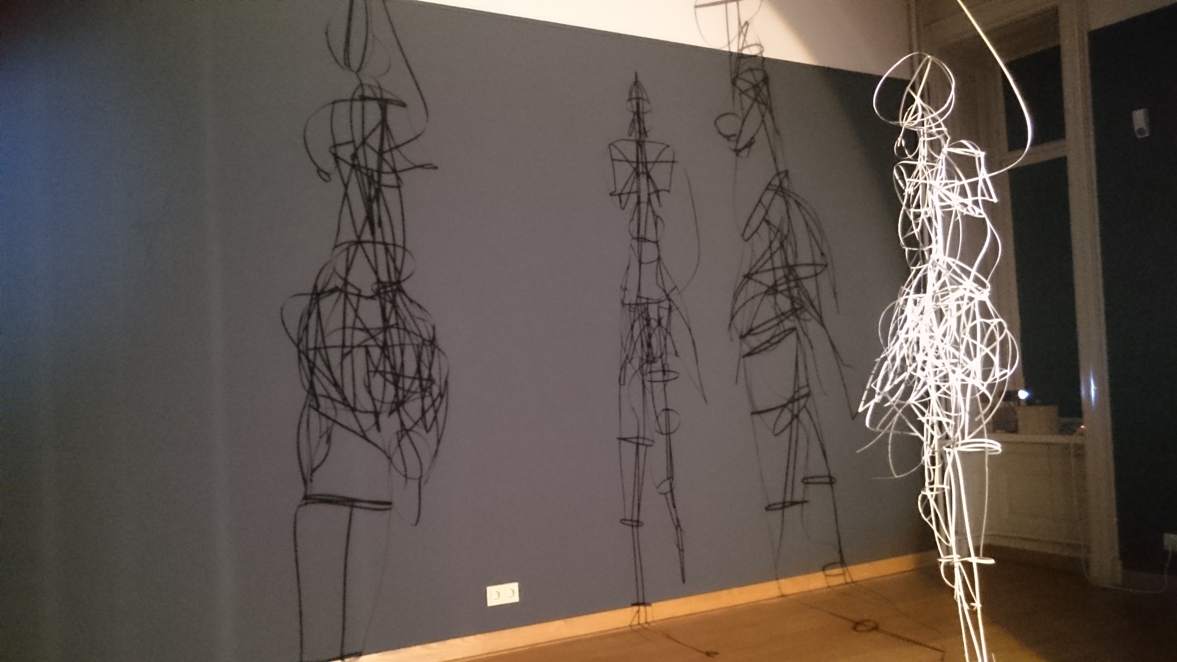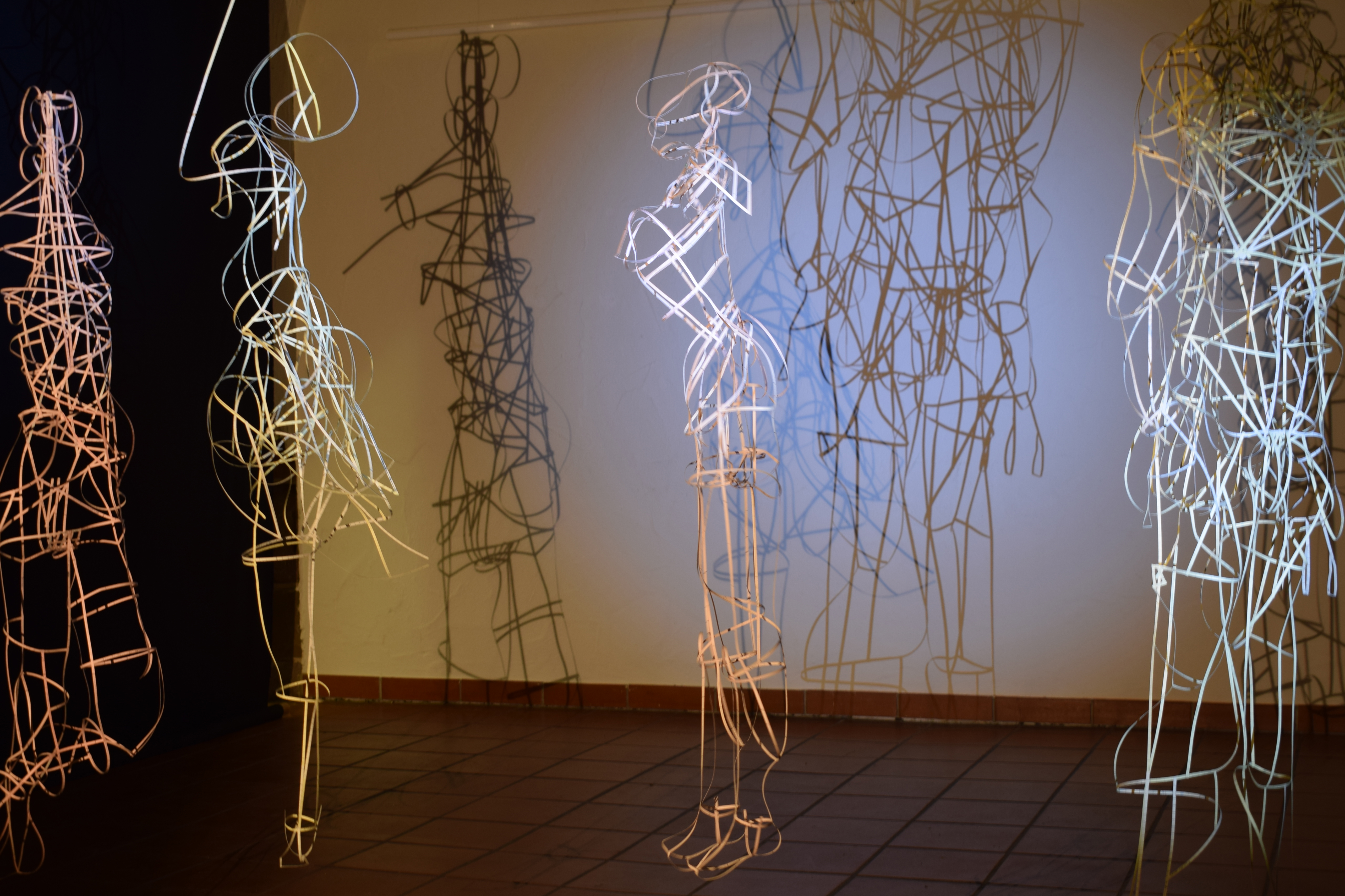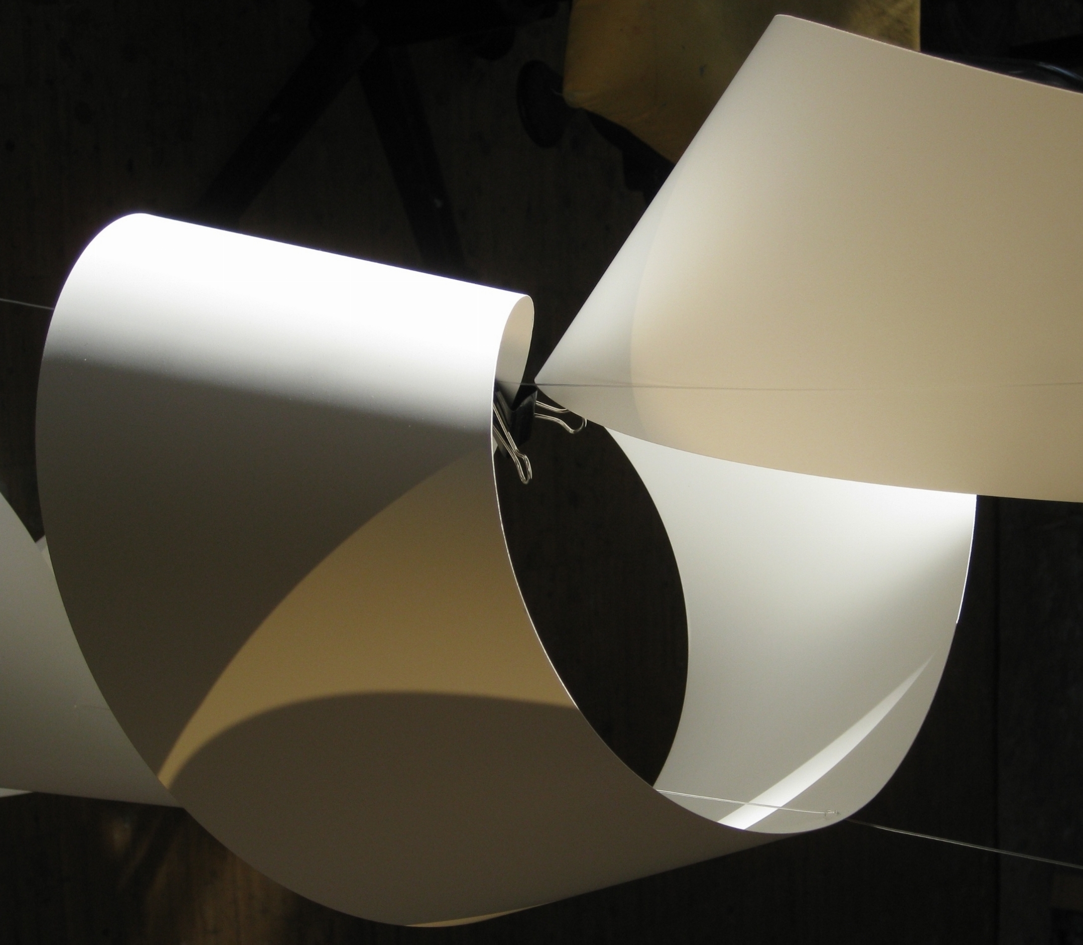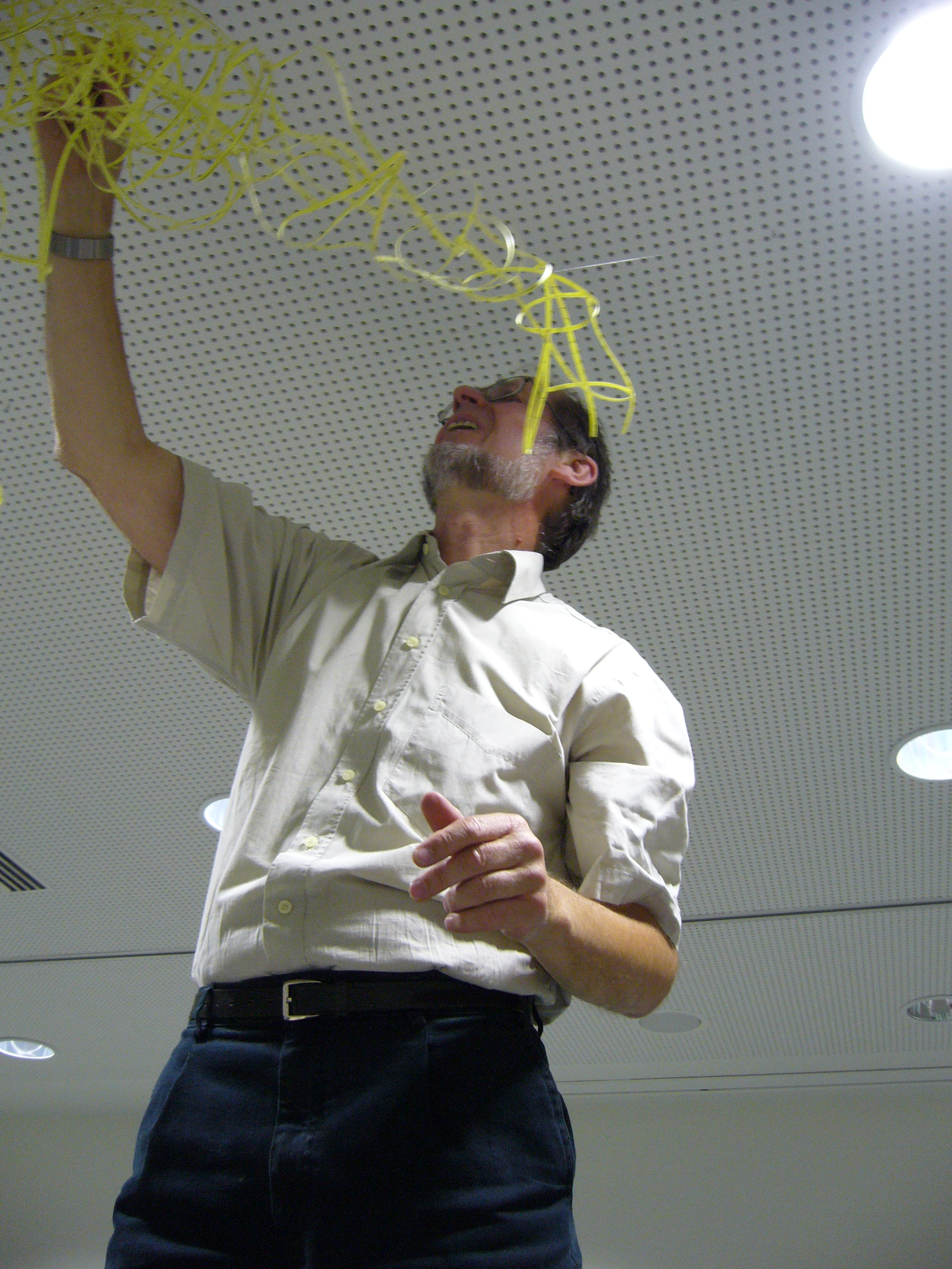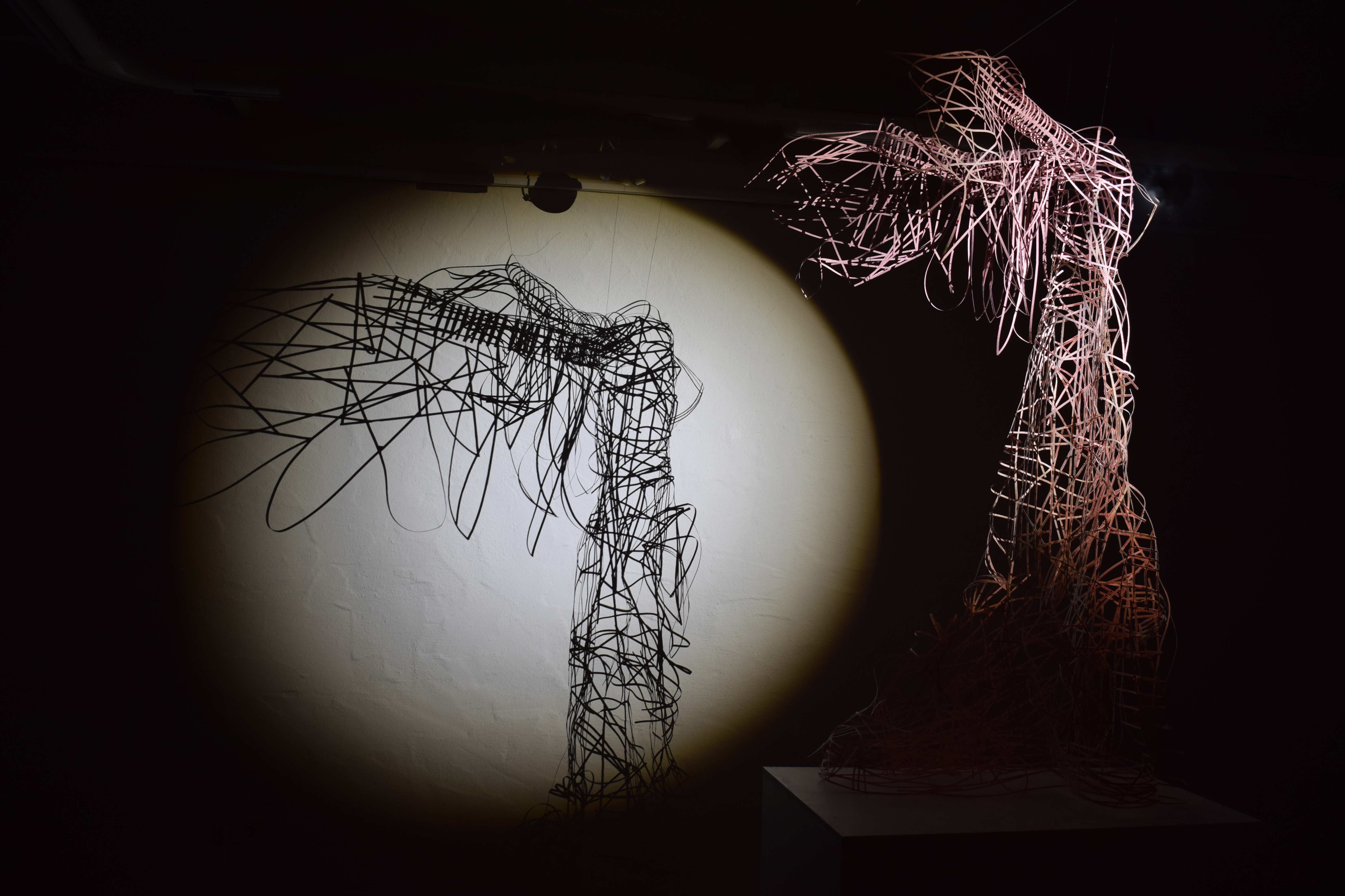 Die Objekte wiegen nur wenige Gramm und sind nur an einem Nylonfaden aufgehängt. Sie erscheinen als dreidimensionale Zeichnungen im Raum, die sich in der Luftströmung bewegen oder sehr langsam in Bewegung gesetzt werden.