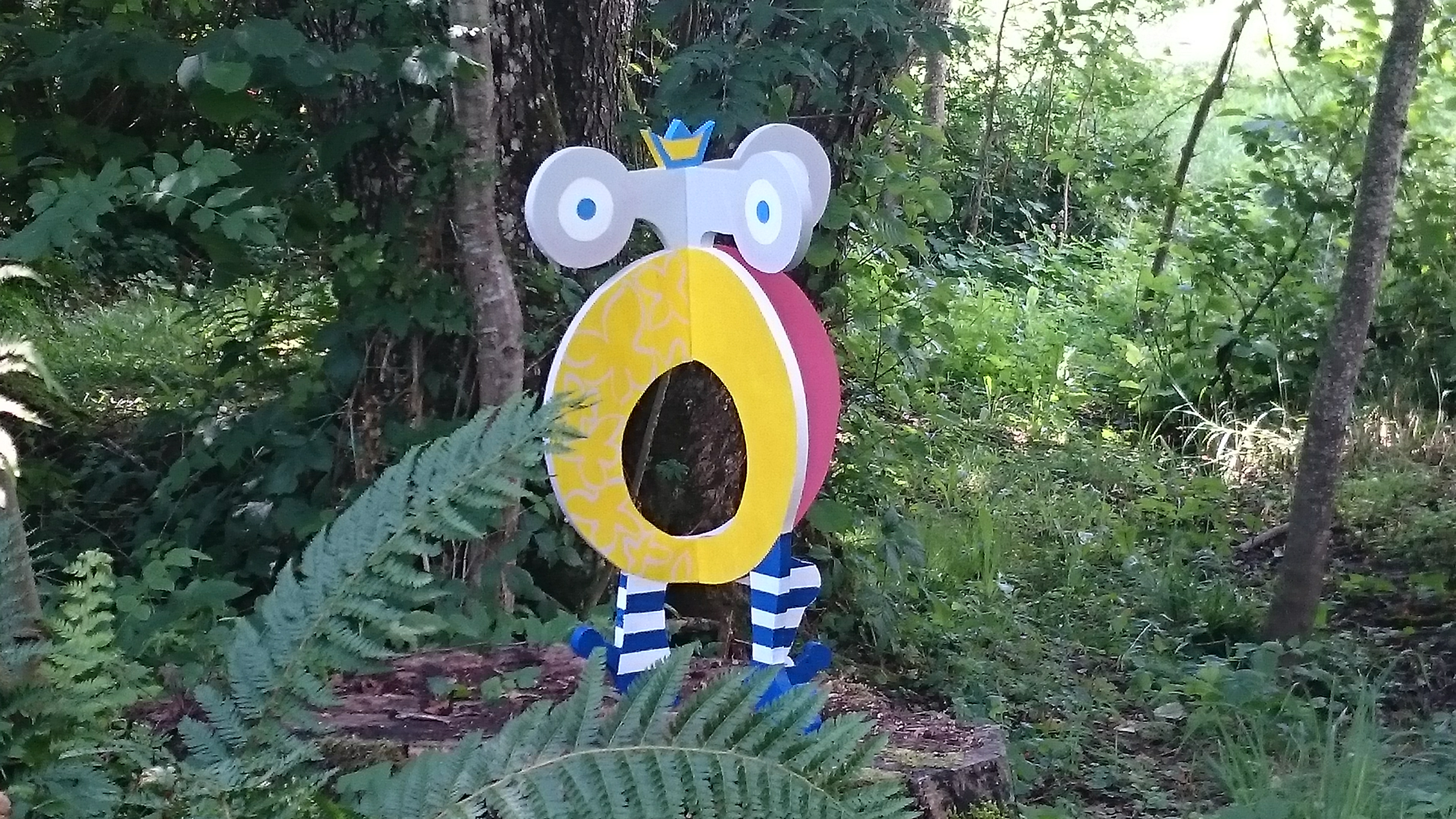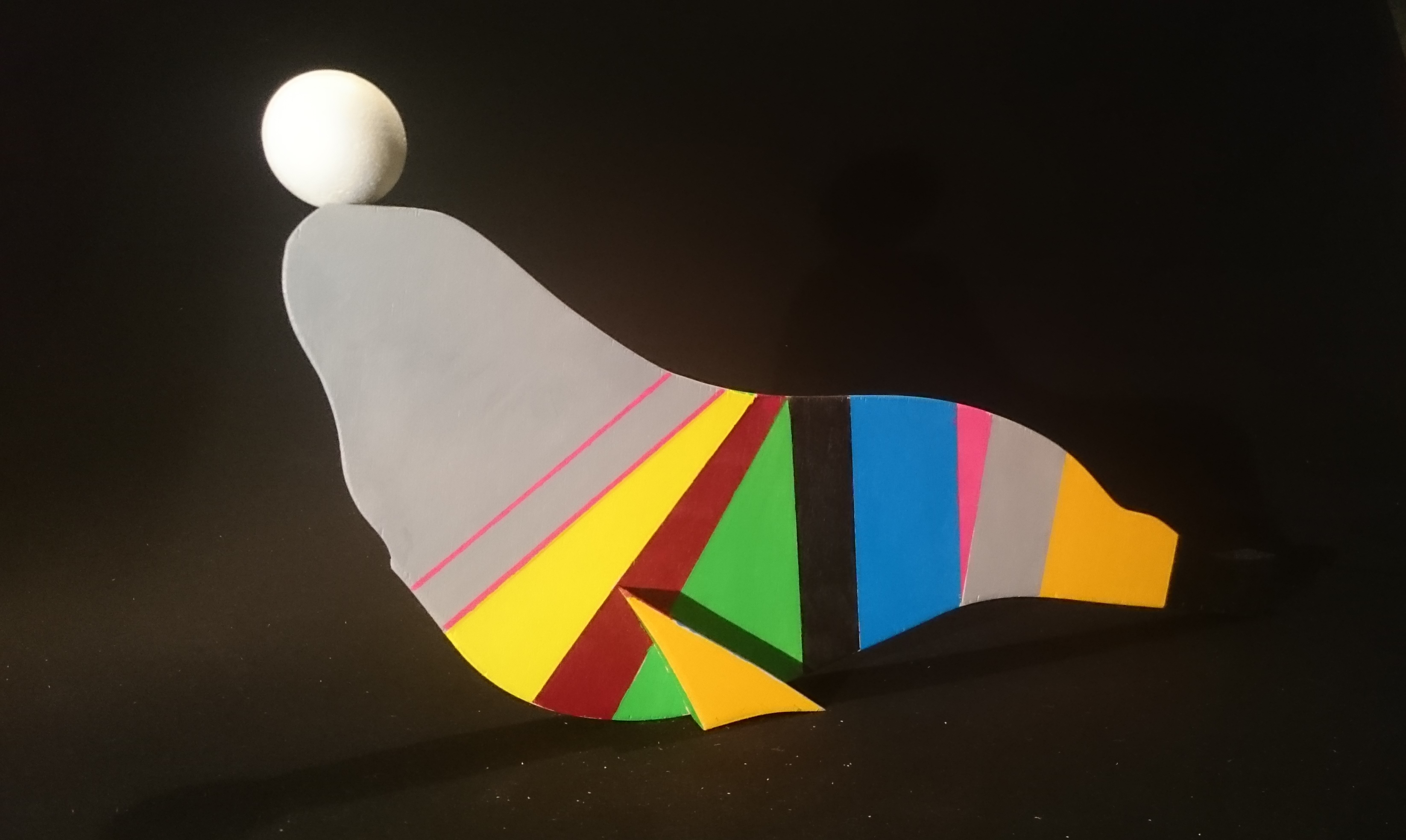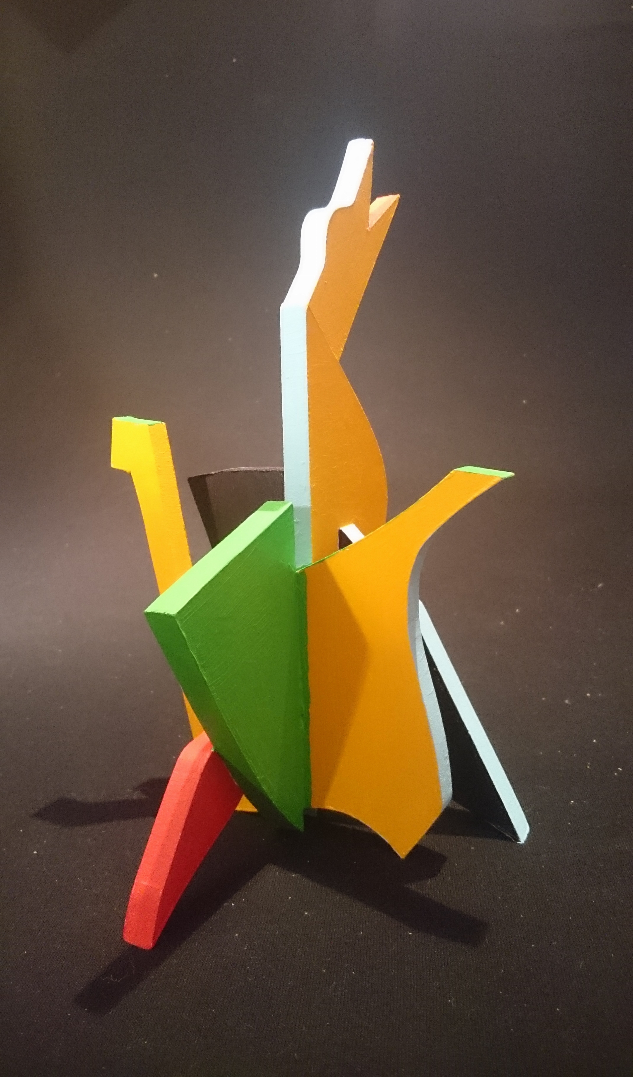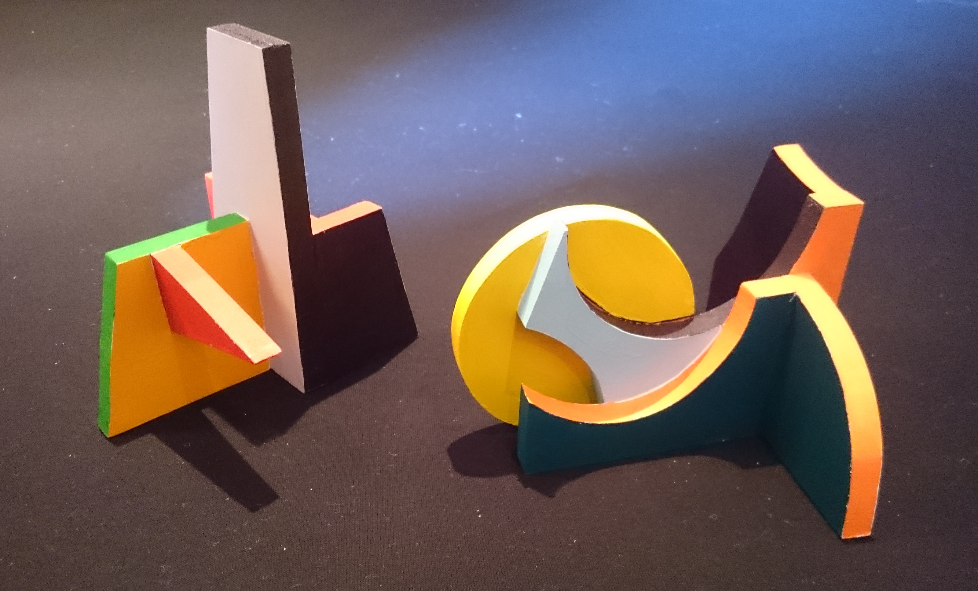 Reihe lebendiges Quadrat: Die kleinen Skulpturen basieren auf einem Quadrat, dessen Innenzeichnung ausgesägt wird. Alle entstehenden Teile werden zu einer dreidimensionalen Skulptur zusammengesetzt und mit Acrylfarben bemalt.